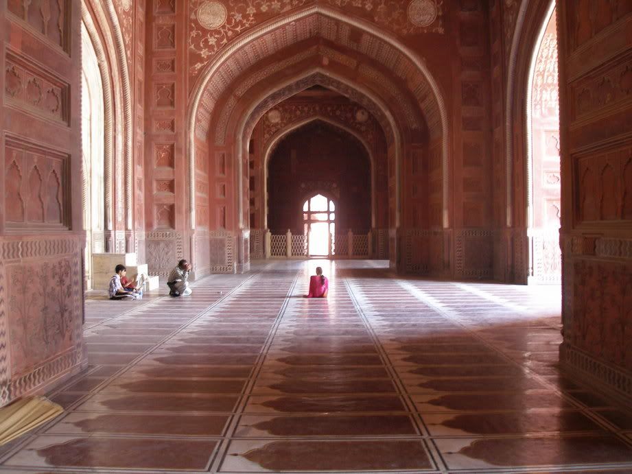 The inlay work in this room, however, is amazing (unfortunately no pictures are allowed). We'd been given a short briefing earlier on the process for making this kind of design - a small 2" flower can be made of fifteen or twenty pieces, each carved from a different kind of stone and originating from a different country, and then arranged to fit into shallow spaces carved out of the marble itself. The kind of concentration, dedication and training this must require is evidenced by the fact that the people who today maintain the Taj, replacing pieces that are lost or go missing, are the ancestors of the craftsmen who first built it.