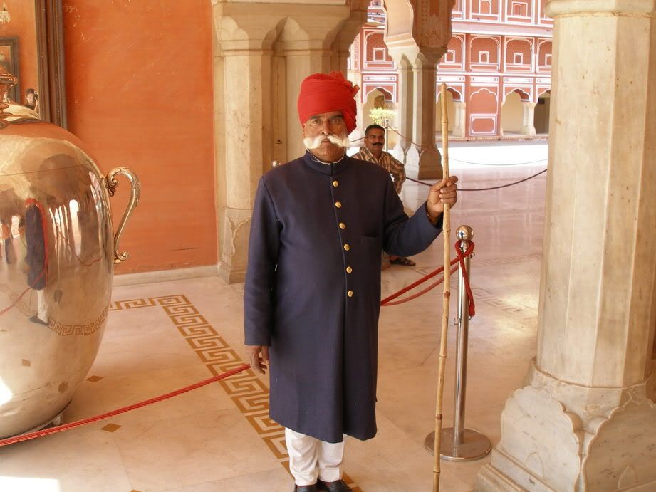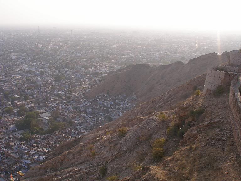 The next day we saw the Hawa Mahal, a beautiful, honeycomb-like structure in the center of downtown that was formerly used by royal ladies for 'peoplewatching', and the City Palace, where we took the picture of the regal guard with the mustache. After an amazing Thali lunch (and Gulab Jamun) we took our rented Auto, via a long and twisted mountain-side road, to the Tiger Fort, which sits atop the mountains that almost completely surround the city of Jaipur. This was maybe the most amazing site we'd seen thus far.